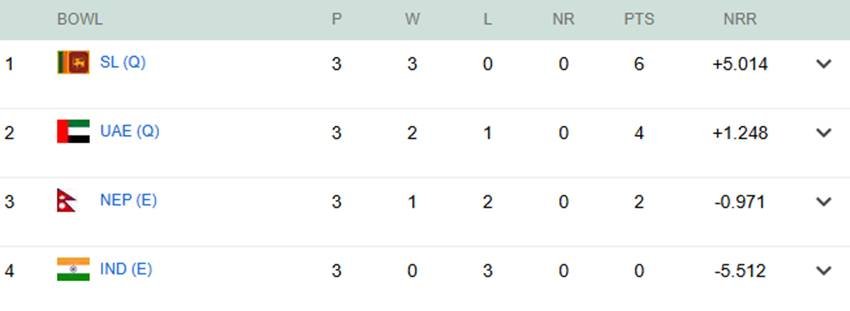 बॉल ग्रुप के सभी टीमों के बीच भी मैच खेला गया जिसमें भारत का सामना नेपाल, यूएई और श्रीलंका के साथ हुआ, लेकिन यहां भी भारत को किसी मैच में जीत नहीं मिली। भारत को बॉल ग्रुप के पहले मैच में नेपाल ने यूएई ने 4 विकेट से हरा दिया जबकि दूसरे मैच में नेपाल ने 92 रन से हरा दिया।