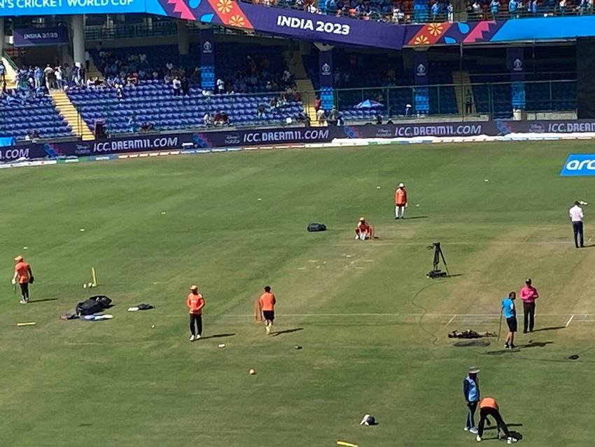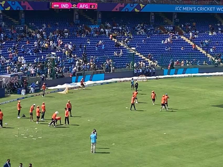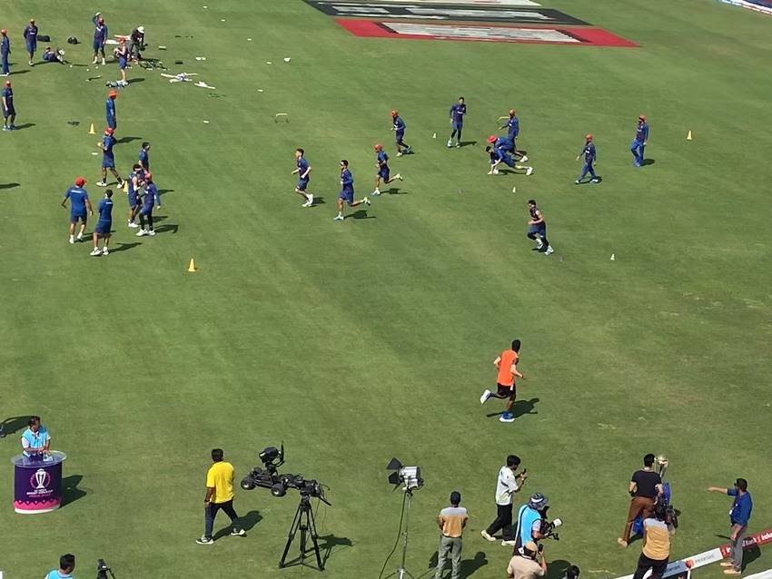 अफगानिस्तान क्रिकेट टीम मुख्य कोच जोनाथन ट्रॉट के साथ मैच से पहले अंतिम बातचीत कर रही है। इस बीच भारतीय क्रिकेट खिलाड़ी 50 मीटर फर्राटा दौड़ रहे हैं। रविचंद्रन अश्विन को स्ट्रेचिंग करते देखा जा सकता है। क्या यही संकेत है? टॉस से 20 मिनट पहले स्टैंड अब भी काफी खाली है।