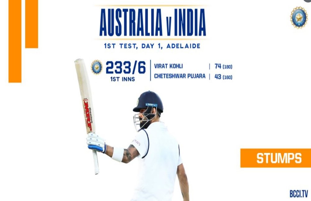 पहले दिन भारत ने 6 विकेट पर 233 रन बना लिए हैं। दिन का खेल खत्म होने तक रविचंद्रन अश्विन 15 और ऋद्धिमान साहा 9 रन बनाकर नाबाद हैं। कोहली 74 रन बनाकर पवेलियन लौट गए। उनका टेस्ट क्रिकेट में यह 22वां अर्धशतक है। कोहली ने 180 गेंद की पारी में 8 चौके लगाए। अजिंक्य रहाणे 92 गेंद पर 42 रन बनाकर आउट हुए। मिशेल स्टार्क ने उन्हें एलबीडब्ल्यू कर दिया। उन्होंने तीन चौके और एक छक्का लगाया। हनुमा विहारी (16) को हेजलवुड ने एलबीडब्ल्यू किया।