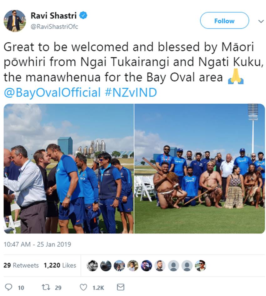 भारतीय टीम के हेड कोच रवि शास्त्री ने भी माओरी समुदाय का शुक्रिया अदा किया। उन्होंने अपने आधिकारिक अकाउंट से ट्वीट किया, “बे ओवल इलाके के माओरी समुदाय से आशीर्वाद पाकर बहुत अच्छा लगा।” माओरी समुदाय न्यूजीलैंड के पॉलिनेशियन समूह का हिस्सा है। यह समुदाय पूर्व पॉलिनेशिया से आया और 1250 से 1300 ई. के बीच यहां बस गए।
