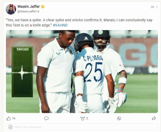 केपटाउन टेस्ट रोमांचक मोड़ पर पहुंच गया है। दक्षिण अफ्रीका ने तीसरे दिन की शुरुआत में पुजारा और रहाणा को आउट पर पकड़ मजबूत कर ली है। वसीम जाफर ने मैच के रोमांच को लेकर एक पोस्ट किया है।