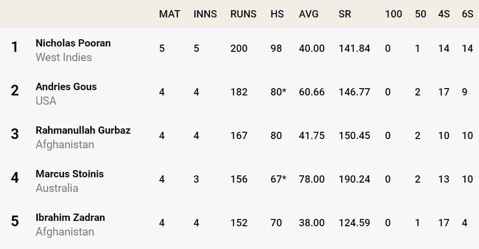 निकोलस पूरन टी20 विश्व कप 2024 में अब तक सबसे ज्यादा रन बना चुके हैं। उनके बाद अमेरिका के एंद्रीस गौस का नंबर आता है।