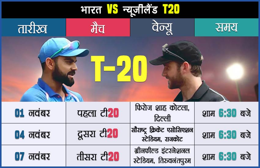 दोनों टीमों के बीच तीन टी-20 मैच एक से 7 नवम्बर के बीच खेले जाएंगे। पहला मैच 1 नवम्बर को दिल्ली में, दूसरा मैच चार नवम्बर को राजकोट में और तीसरा मैच सात नवम्बर को तिरुवनंतपुरम में खेला जाएगा। दिग्गज तेज गेंदबाज आशीष नेहरा को केवल पहले टी20 के लिए टीम में शामिल किया गया है, वह इस मैच के बाद सन्यास लेंगे।
