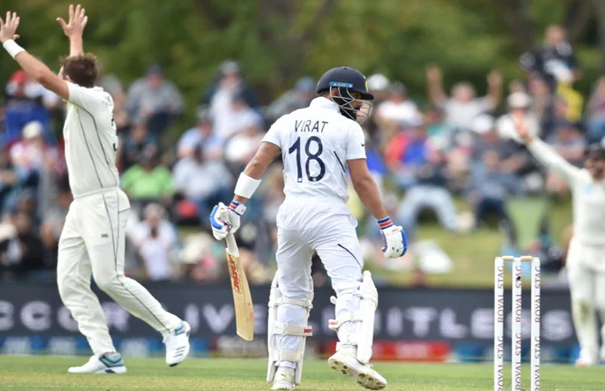 वे साउदी की सीधी गेंद को सही से नहीं खेल पाए। गेंद सीधे जाकर उनके पैड पर लगी। साउदी की अपील पर अंपायर ने उन्हें आउट करार दिया। भारतीय कप्तान ने नॉन-स्ट्राइकर एंड पर खड़े चेतेश्वर पुजारा से बात की। इसके बाद उन्होंने रिव्यू ले लिया। रिव्यू में भी आउट ही नजर आए और मैदानी अंपायर का निर्णय कायम रहा। कोहली 13 बार टेस्ट में रिव्यू ले चुके हैं। 11वीं बार निर्णय उनके खिलाफ गया। 2017-18 में कोलकाता में हुए श्रीलंका के खिलाफ टेस्ट मैच के बाद से कोई भी रिव्यू एक बल्लेबाज के तौर पर कोहली के पक्ष में नहीं गया।