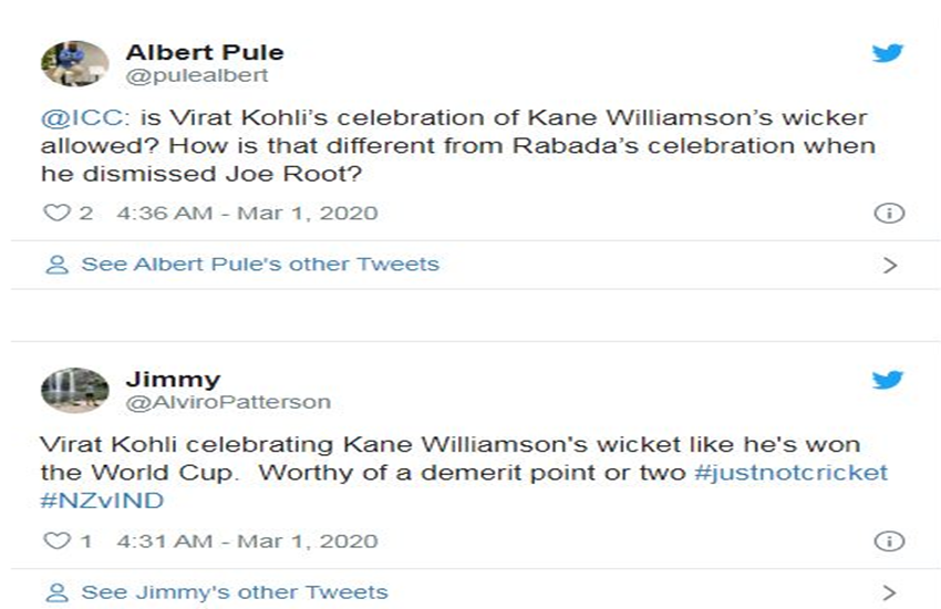 इसके बाद न्यूजीलैंड के चौथे बल्लेबाज के रूप में टॉम लाथम आउट हुए। वे लगातार डिफेंसिव स्ट्रोक खेल रहे थे। इसी बीच मोहम्मद शमी की एक गेंद उनके विकेटों में समा गई। कोहली फिर से आक्रामक हो गए। उन्होंने लाथम को भी पवेलियन लौटने का इशारा किया। इन दो प्रतिक्रियाओं के बाद फैंस ने ट्विटर पर अलग-अलग रिएक्शन दिए। एक तरफ कुछ को कोहली के इस रिएक्शन से खुशी मिली, तो कई फैंस ने इसे आईसीसी के नियमों के खिलाफ बताया।