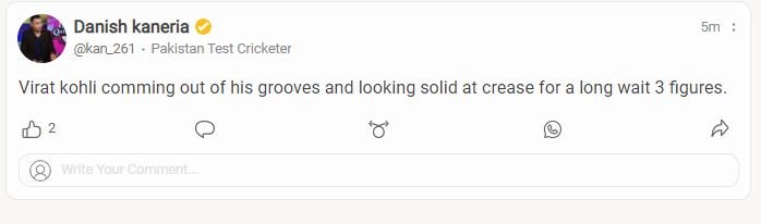 भारतीय कप्तान विराट कोहली के 71वें शतक का पूरी दुनिया को बेसब्री से इंतजार है। दक्षिण अफ्रीका के खिलाफ जारी केपटाउन टेस्ट में विराट कोहली इस वक्त 70 से अधिक रनों पर बल्लेबाजी कर रहे हैं और टिके हैं। लेकिन दूसरी ओर से विकेट गिर रहे हैं। उनको लेकर दानिश कनेरिया ने किया ये पोस्ट :-