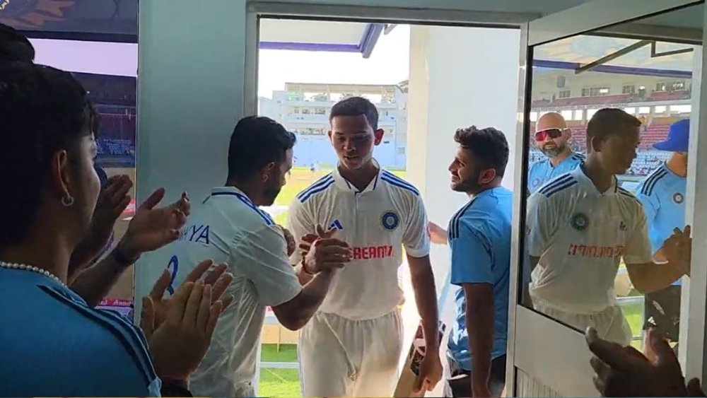 अंतरराष्ट्रीय करियर के पहले ही मैच में शतक लगाकर यशस्वी जायसवाल छा गए हैं। वेस्टइंडीज के खिलाफ डोमिनिका टेस्ट के दूसरे दिन जायसवाल 143 रन बनाकर नाबाद रहे। दिन का खेल खत्म होने के बाद जब जायसवाल पवेलियन लौटे तो उनका जोरदार स्वागत हुआ। बीसीसीआई ने वीडियो शेयर करके फैंस को यह खास लम्हा दिखाया।