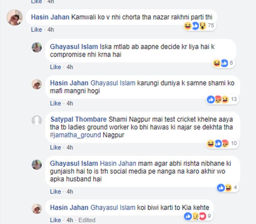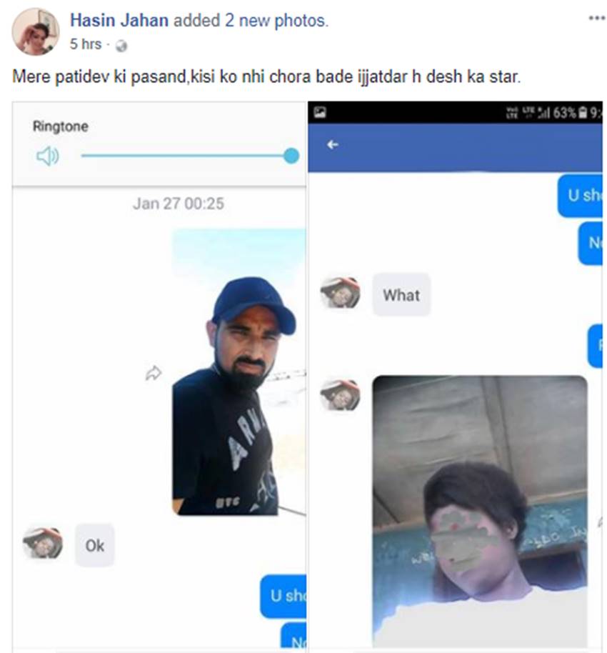 भारतीय टीम के तेज गेंदबाज मोहम्मद शमी की पत्नी हसीन जहां ने अपने पति पर घरेलू हिंसा, विवाहेतर संबंध रखने जैसे गंभीर आरोप लगाए हैं। इसके बाद से हसीन जहां अपने पति के साथ अन्य महिलाओं के कई चैट सोशल मीडिया पर शेयर कर चुकी हैं। अब हसीन जहां ने अपने फेसबुक अकाउंट पर कुछ और चैट शेयर किए हैं, जिसमें शमी किसी महिला से बात कर रहे हैं। हसीन जहां ने इसके साथ लिखा- “मेरे पतिदेव की पसंद। किसी को नहीं छोड़ा… बड़ा इज्जतदार है देश का स्टार।”