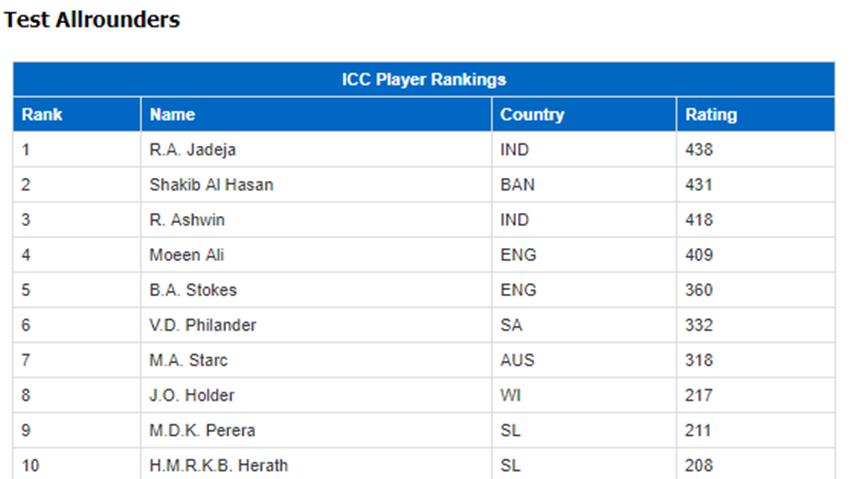 भारतीय क्रिकेटर रवींद्र जडेजा टेस्ट में बांग्लादेश के शाकिब-अल-हसन को पछाड़कर नंबर -1 ऑलराउंडर बन गए हैं। जडेजा ने श्रीलंका के खिलाफ दूसरे टेस्ट मैच में 7 विकेट चटकाकर मैन ऑफ द मैच का खिताब भी हासिल किया था। जडेजा के 438 अंक हैं, जबकि शाकिब अल हसन के 431 प्वाइंट्स। वहीं रविचंद्रन अश्विन 418 प्वाइंट्स के साथ तीसरे पायदान पर हैं। ऑलराउंडर्स की लिस्ट में इंग्लैंड और श्रीलंका के 2-2 खिलाड़ी मौजूद हैं।