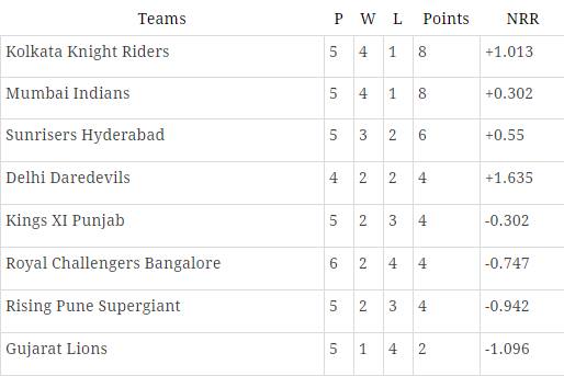 मुंबई इंडियन्स दूसरे पायदान पर है और उसका नेट रन रेट +0.302 का है। तीसरे पायदान पर सनराइजर्स हैदराबाद की टीम है, जिसने 5 मैच खेलकर 3 में जीत हासिल की है। उसके 6 पॉइंट्स हैं। इसके बाद चौथे पायदान पर दिल्ली डेयरडेविल्स की टीम है। दिल्ली की टीम ने 4 मैचों में 2 में जीत हासिल की और दो में उसे हार नसीब हुई। पांचवे पायदान पर किंग्स XI पंजाब की टीम है, जिसने 5 में से 2 मैच जीते हैं।
