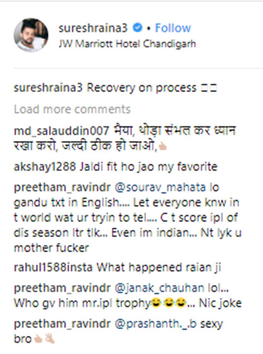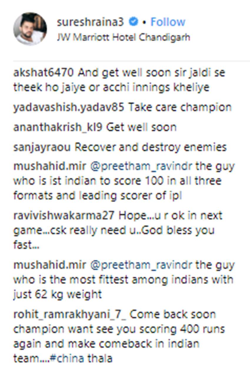 ताजा फोटो रैना ने अपने इंस्टाग्राम अकाउंट पर पोस्ट किया। यह फोटो उन्होंने चंडीगढ़ स्थित जेडब्ल्यू मैरियट होटल से डाला था। वह होटल के कमरे में बेड रेस्ट लेते नजर आ रहे थे। पैरों में रैना ने इस दौरान दो बड़े रिकवरी पम्प वाले कवर पहन रखे थे। देखिए, लोगों ने उनकी पोस्ट पर कैसी-कैसी प्रतिक्रियाएं दीं-