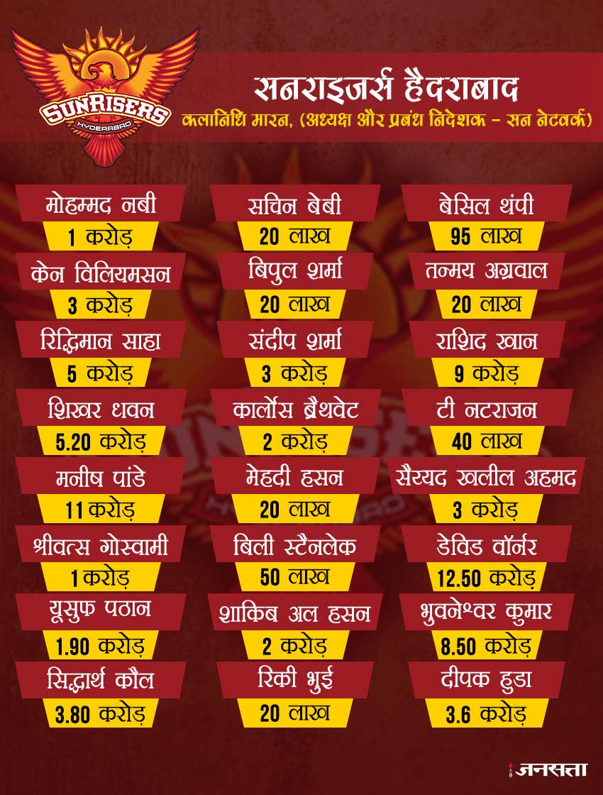 साहा ने हाल ही में एक घरेलू टी-20 मैच में 20 गेंदों में शतक लगाया था। इनके अलावा राजस्थान रॉयल्स, कोलकाता नाइट राइडर्स के साथ खिताब जीतने का स्वाद चख चुके युसूफ पठान इस बार सनराइजर्स की जर्सी में दिखेंगे। सनराइजर्स के लिए सबसे अच्छी बात वेस्टइंडीज के कार्लोस ब्राथवेट और बांग्लादेश के शाकिब अल हसन जैसे हरफनमौला खिलाड़ी हैं।