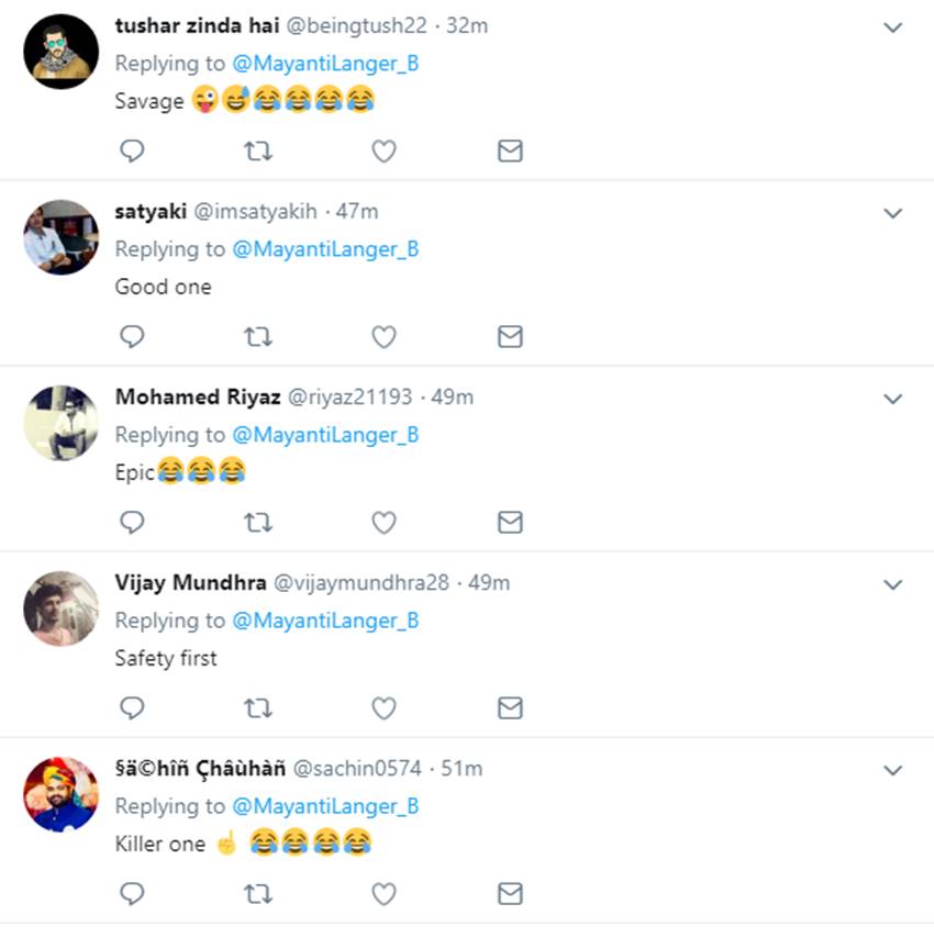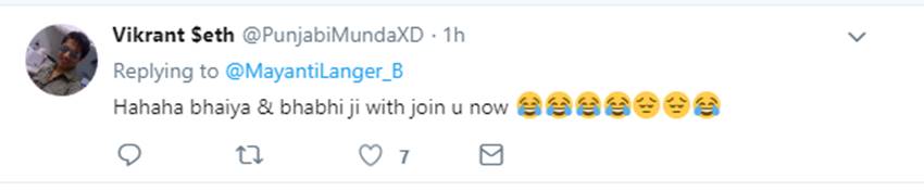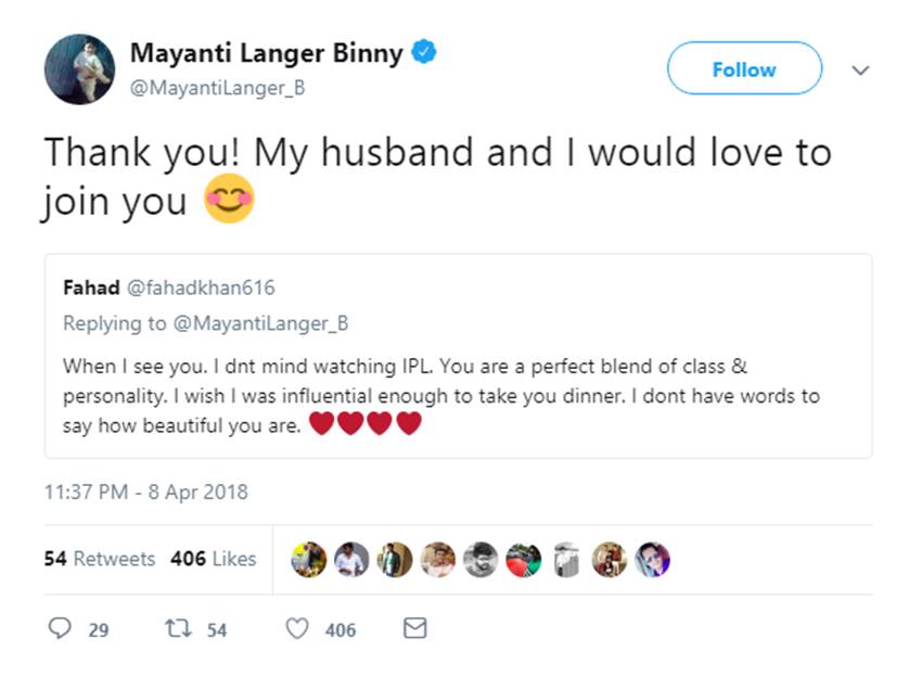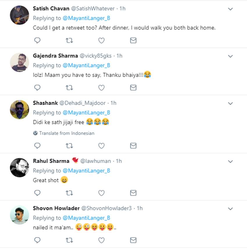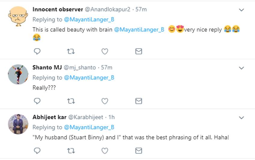 मयांती ने इसी के जवाब में लिखा, “शुक्रिया! मेरे पति और मुझे आपके साथ चलने में (डिनर पर) खुशी होगी।” फिर क्या था, लोगों ने एंकर के जवाब के बाद शख्स के मजे लेना शुरू कर दिया। लोगों ने मयांती की तारीफ की।
