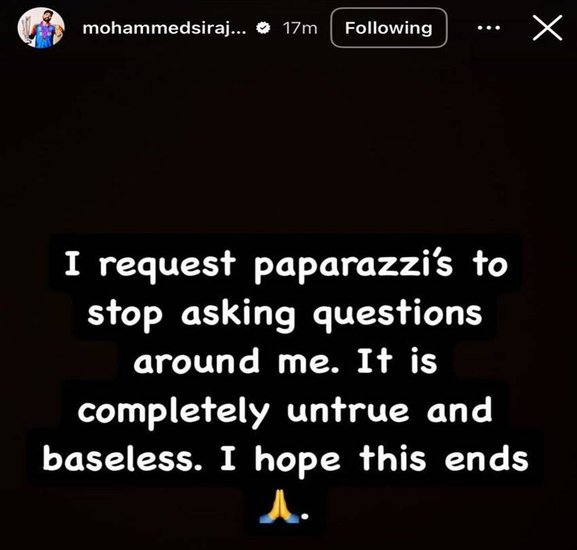 इन सारी बातों के बीच मोहम्मद सिराज ने भी इस पर अपनी चुप्पी तोड़ी है। भारतीय क्रिकेट टीम के तेज गेंदबाज ने अपने इंस्टाग्राम अकाउंट पर मीडिया से हाथ जोड़कर अनुरोध किया कि वो इस तरह के सवाल ना पूछें और सारी बातें निराधार हैं। उन्होंने लिखा कि मैं पैपराजी से अनुरोध करता हूं कि वो मेरे आस-पास सवाल ना पूछें। यह पूरी तरह से झूठ और निराधार है। मुझे उम्मीद है कि यह खत्म हो जाएगा।