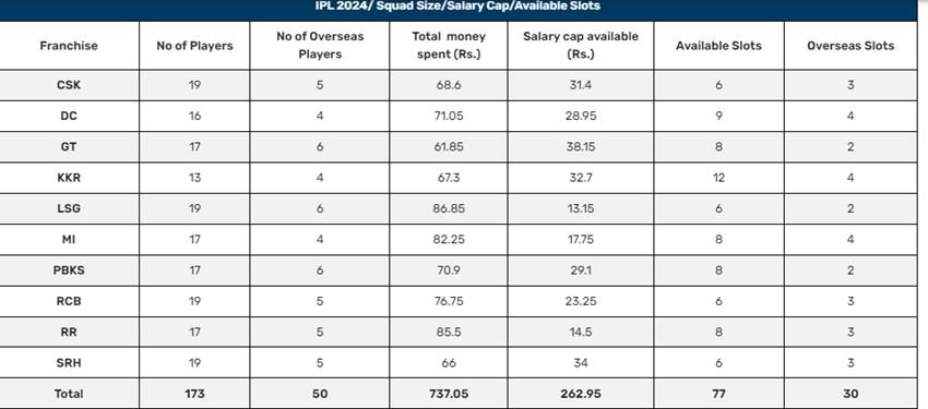 टीमों के खाली जगह की बात करें तो चेन्नई सुपर किंग्स के पास इस सीजन के लिए 6 जगह खाली हैं जिसमें 3 विदेशी खिलाड़ी होंगे जबकि इस टीम के पर्स में अभी 31.4 करोड़ रुपये शेष हैं। दिल्ली कैपिटल्स के पास अब 9 स्थान खाली है जिसमें 4 स्थान ओवरसीज प्लेयर के लिए है जबकि इस टीम के पास इस नीलामी के लिए पर्स में 28.95 करोड़ रुपये बचे हैं। गुजरात टाइटंस की बात करें तो इस टीम के पास अभी 38.15 करोड़ रुपये बचे हैं और खिलाड़ियों के लिए इस टीम के पास 8 स्लाट खाली हैं जिसमें दो ओवसीज प्लेयर हैं।