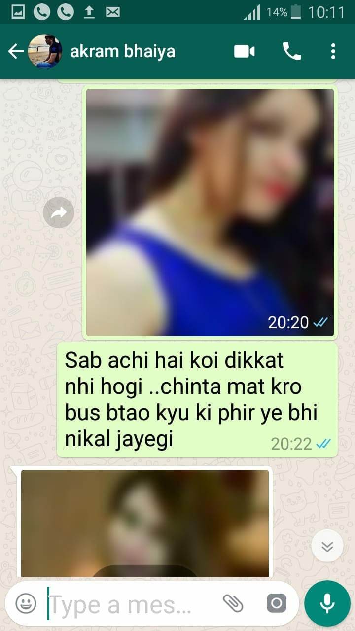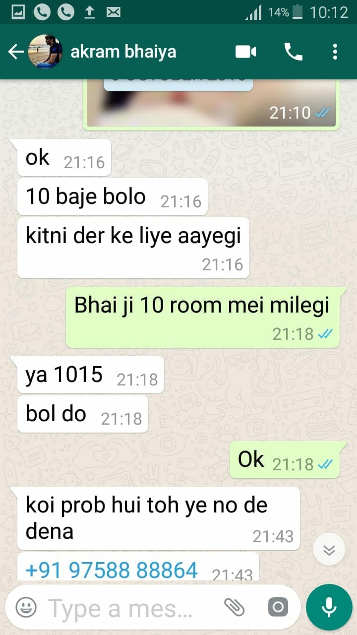 चैटिंग में क्या हैः वाट्सअप पर राहुल शर्मा से अकरम लड़कियों की तस्वीरें मंगाता है। इस पर अकरम कहता है-कोई नई(लड़की) नहीं है। फिर कहता है-साढ़े नौ बजे तक चाहिए। फिर एक चैट में अकरम सैफी लड़की को 1015 रूम नंबर में भेजने की बात कह रहा। लड़की पहुंचने के बाद अकरम कहता है-चिंता मत करो, तुम्हारा सिलेक्शन जरूर होगा। तुम अपना पूरा नाम और चेस्ट नंबर मैसेज करो।