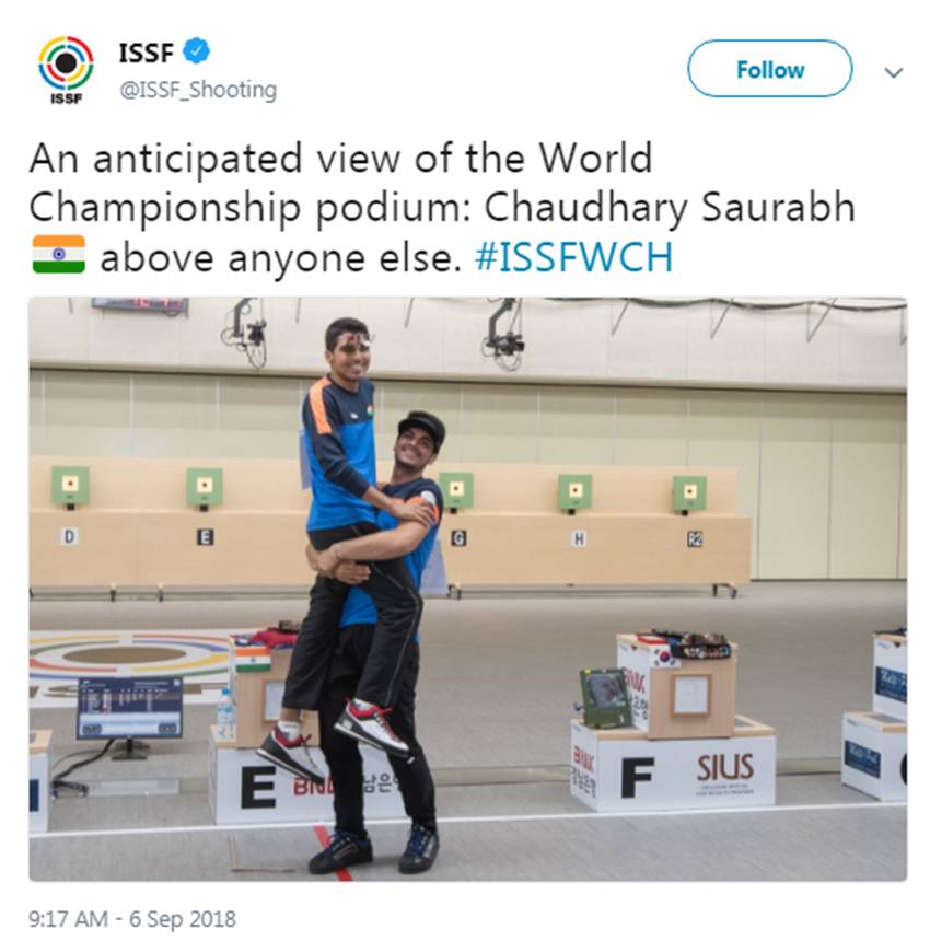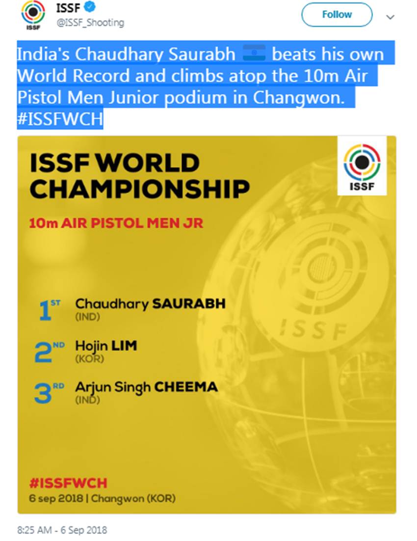 सौरभ ने फाइनल मुकाबले में कुल 245.5 अंक हासिल किए। यह जूनियर वर्ग में वर्ल्ड रेकॉर्ड है, जबकि देश के अर्जुन चीमा इवेंट में तीसरे स्थान पर रहकर कांस्य पदक पाए। उन्हें 218 अंक मिले। वहीं, कोरिया के लिम होजिन ने रजत पदक पर कब्जा जमाया। उनको प्रतियोगिता में 243.1 अंक मिले थे।