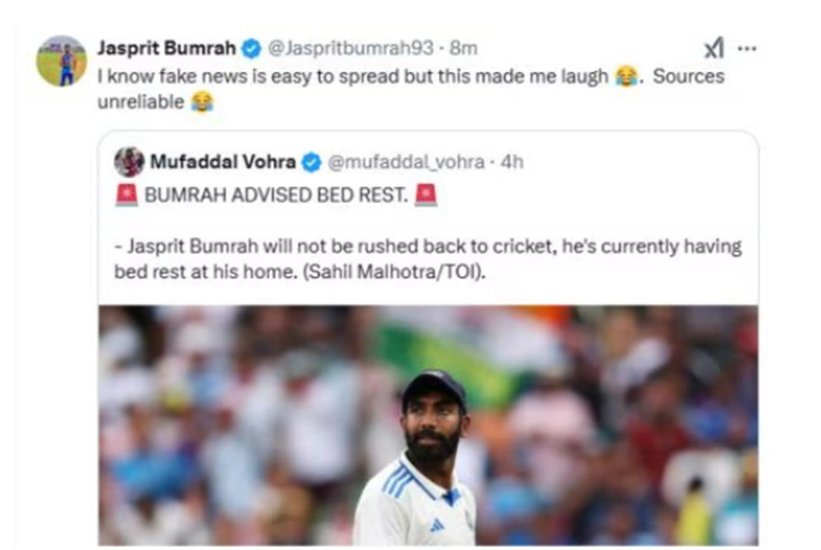 एक्स पर एक कंटेंट एग्रीगेटर के ट्वीट को बुमराह की प्रतिक्रिया के बाद हटा दिया गया । मूल पोस्ट पर प्रतिक्रिया देते हुए, बुमराह ने लिखा,”मुझे पता है कि फर्जी खबरें फैलाना आसान है, लेकिन इससे मुझे हंसी आ गई। सोर्स विश्वास लायक नहीं है।” इंडियन एक्सप्रेस ने पिछले रविवार (12 जनवरी) को बताया था कि बुमराह की पीठ में सूजन है और उन्हें बेंगलुरु में नेशनल क्रिकेट एकेडमी (NCA) में रिपोर्ट करने के लिए कहा गया है, जहां उनकी रिकवरी पर नजर रखी जाएगी।
