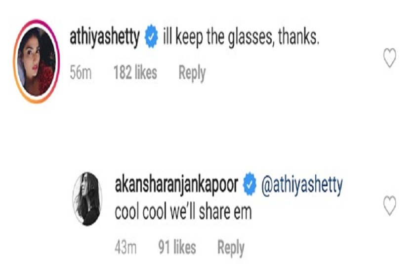 इस तस्वीर पर कमेंट करते हुए एक्ट्रेस आथिया शेट्टी ने लिखा कि वह इस चश्में को अपने पास रखना चाहेंगी। इसपर आकांक्षा रंजन कपूर ने उनको जवाब देते हुए लिखा कि वे दोनों ही इसे शेयर करेंगी। बता दें कि आकांक्षा एक मॉडल हैं और आलिया भट्ट की करीबी दोस्त हैं।