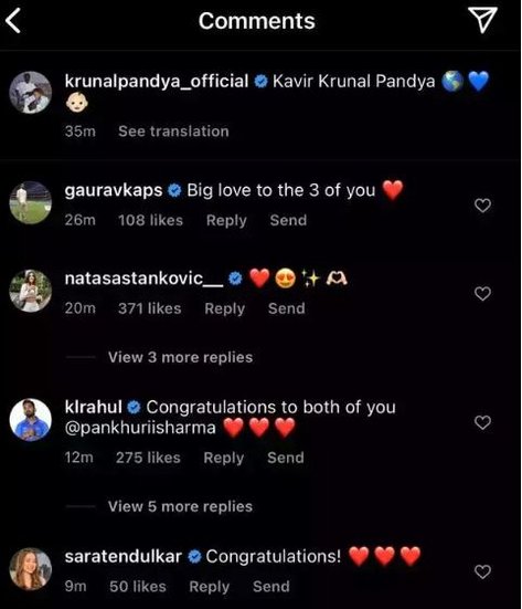 इस मौके को यादगार बनाने के लिए क्रुणाल के भाई हार्दिक पंड्या ने अपने भाई और भाभी को इंस्टाग्राम पर बधाई दी। गुजरात टाइटन्स (GT) के कप्तान ने एक स्टोरी पोस्ट की, जिसमें उन्होंने क्रुणाल और पंखुड़ी दोनों को टैग करते हुए ‘लव यू बेबीज’ लिखा। इंस्टाग्राम पर क्रुणाल की पोस्ट पर रिएक्ट हुए हार्दिक की पत्नी नतासा, लखनऊ सुपर जायंट्स (LSG) में क्रुणाल के कप्तान केएल राहुल, टीम के साथी मोहसिन खान और सचिन तेंदुलकर की बेटी सारा सहित अन्य लोगों ने इस जोड़े को बधाई दी।