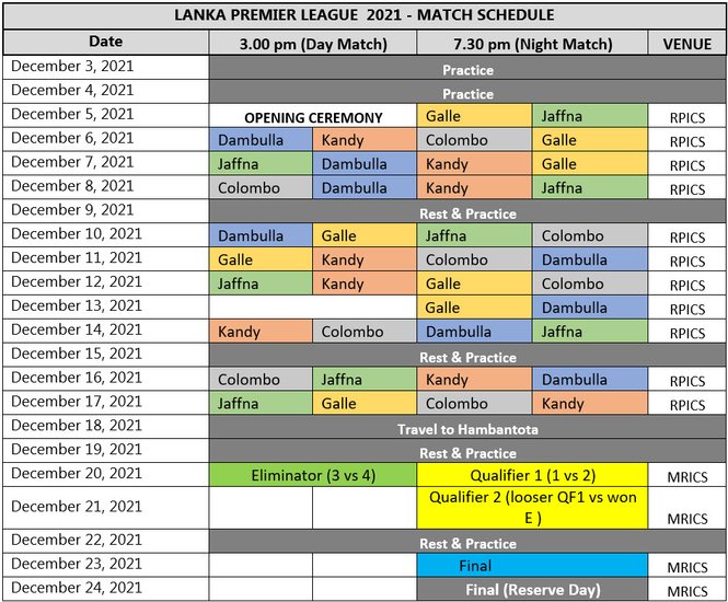 इसके बाद क्वालीफायर-1, एलिमिनेटर और क्वालीफायर-2 हम्बनटोटा के महिंद्रा राजपक्षे इंटरनेशनल क्रिकेट स्टेडियम में आयोजित होंगे। फाइनल मुकाबला भी इसी मैदान पर 23 दिसंबर को खेला जाएगा। खिताबी मुकाबले के लिए 24 दिसंबर के दिन को भी रिजर्व किया गया है।