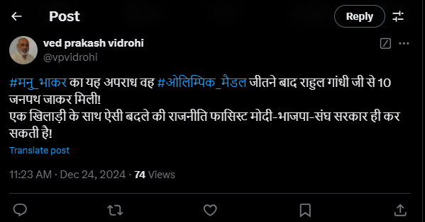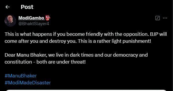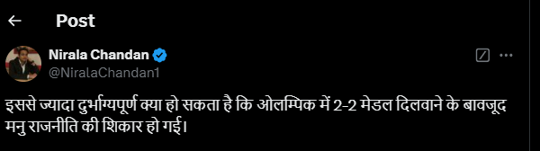 एक्स पर कई यूजर्स ने लिखा की पेरिस ओलंपिक की डबल मेडलिस्ट राजनीति का शिकार हुई हैं। ओलंपिक में मेडल जीतने के बाद मनु ने भारत लौटने पर नेता विपक्ष राहुल गांधी से मुलाकात की थी। इसके अलावा वह हरियाणा में कांग्रेस नेता दीपेंदर हुड्डा से भी मिली थीं। लोग मनु के नाम की गैरमौजूदगी का इसी से कनेक्शन बता रहे हैं।