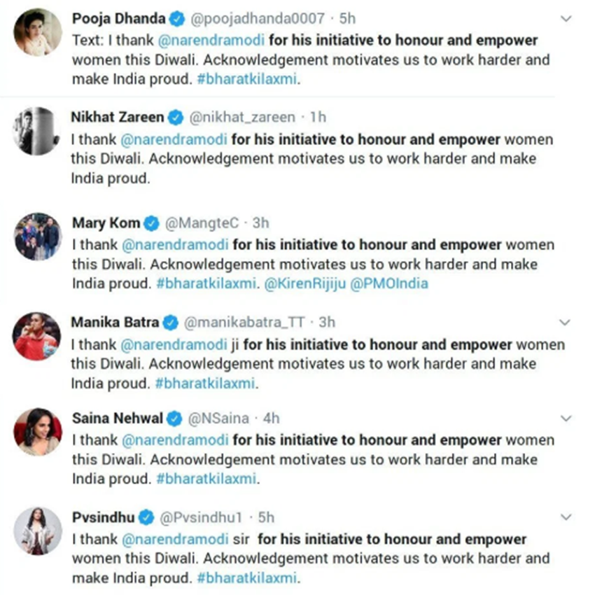 दिवाली की पूर्व संध्या पर, कई महिला खिलाड़ियों ने ट्वीट किया था, ‘मैं इस दिवाली महिलाओं को सम्मान और सशक्त बनाने की उनकी पहल के लिए @narendramodi को धन्यवाद देतीं हूं। इससे हमें कड़ी मेहनत करने और भारत को गौरवान्वित करने की प्रेरणा मिलती है। #bharatkilaxmi.’ हालांकि, देखने में कॉपी-पेस्ट का मामला समझ में आया। सभी खिलाड़ियों ने अपने आधिकारिक ट्विटर हैंडल से एक जैसी भाषा वाली ही पोस्ट की थीं।