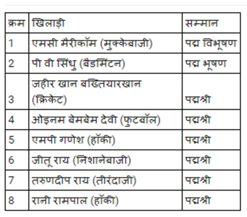 मैरीकॉम और पीवी सिंधु के अलावा खेल जगत की 6 और बड़ी हस्तियों को पद्म पुरस्कारों के लिए चुना गया है। इसमें भारतीय क्रिकेटर जहीर खान भी शामिल हैं। जहीर खान को पद्मश्री के लिए चुना गया है।