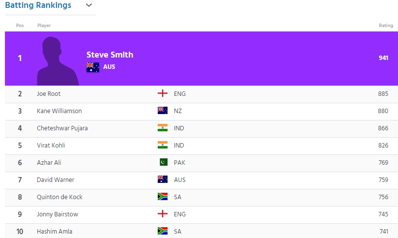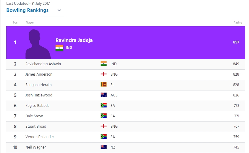 स्टार स्पिनर रविंद्र जाडेजा ने आज जारी हुई आईसीसी टेस्ट रैंगिंग में गेंदबाजों की सूची में अपना शीर्ष स्थान पर बरकरार रखा है जबकि विराट कोहली बल्लेबाजों की रैंकिंग में पांचवें स्थान पर कायम हैं। बल्लेबाजों की रैंकिंग में चेतेश्वर पुजारा चौथे स्थान के साथ शीर्ष भारतीय हैं जबकि सलामी बल्लेबाज शिखर धवन 21 स्थान की लंबी छलांग के साथ 39वें स्थान पर पहुंच गए हैं। अॉस्ट्रेलिया के कप्तान स्टीव स्मिथ बल्लेबाजों की सूची में शीर्ष पर हैं जबकि उनके बाद इंग्लैंड के कप्तान जो रूट और न्यूजीलैंड के कप्तान केन विलियमसन का नंबर आता है। गेंदबाजों की सूची में रविचंद्रन अश्विन ने श्रीलंका के कप्तान रंगना हेराथ को पछाड़ते हुए एक बार फिर दूसरा स्थान हासिल किया। हेराथ तीसरे स्थान पर हैं। तेज गेंदबाज मोहम्मद शमी एक स्थान के फायदे से 23वें पायदान पर हैं। जाडेजा और अश्विन ने आलराउंडरों की सूची में भी क्रमश: दूसरा और तीसरा स्थान बरकरार रखा है। बांग्लादेश के शाकिब अल हसन आलराउंडरों की सूची में शीर्ष पर हैं।