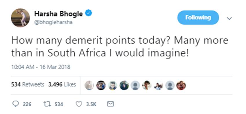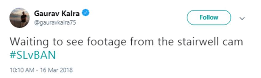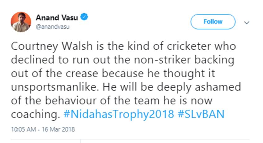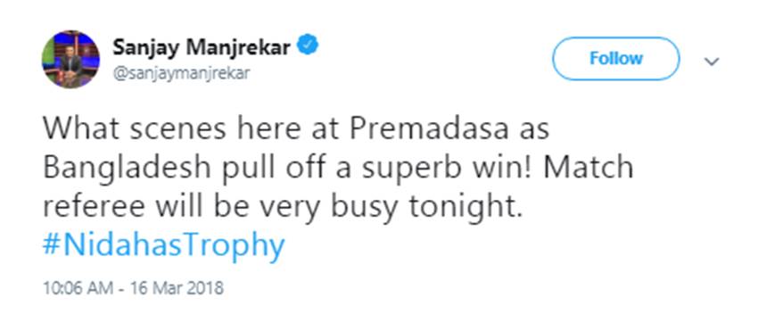 भारतीय टीम के पूर्व क्रिकेटर और क्रिकेट एक्सपर्ट संजय मांजरेकर ने घटना की रात ट्वीट कर कहा, “बांग्लादेश ने जीत हासिल करने के बाद क्या सीन क्रिएट किया! मैच रेफरी तो आज रात बेहद व्यस्त होगा।” क्रिकेट एक्सपर्ट हर्षा भोगले ने कहा, “आज टीम को कितने डीमेरिट प्वॉइंट्स मिलेंगे? मुझे लगता है कि दक्षिण अफ्रीका से भी ज्यादा!” खेल पत्रकार गौरव कालरा बोले, “कैमरे की फुटेज देखने का इंतजार कर रहा हूं।” वहीं, आंनद वसु नामक स्वतंत्र पत्रकार ने कहा, “बांग्लादेश की इस हरकत से कर्टनी वॉश सरीखे खिलाड़ी को भी खराब लगा होगा, जो इस टीम के कोच हैं।”