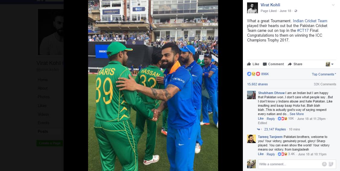 दीपिका और प्रियंका के भी क्रमश: 34, 048,200 और 31,726,023 फैन्स हैं। सर्वकालीन महान बल्लेबाज सचिन तेंडुलकर भी विराट के पास नहीं ठहरते। उनके भी फेसबुक पर 28,536, 442 फैन्स हैं। लोगों में विराट की दीवानगी का अंदाजा इसी बात से लगाया जा सकता है कि उनके आधिकारिक फेसबुक पेज पर उनकी प्रोफाइल फोटो को 7 लाख 34 हजार लोगों ने लाइक किया है और 2070 हजार लोगों ने इसे शेयर किया है। यह तस्वीर विराट ने 21 जून को पोस्ट की थी। वहीं 18 जून को चैम्पियंस ट्रॉफी के फाइनल में पाकिस्तान से हारने के बाद विपक्षी टीम को बधाई देते विराट की तस्वीर को फेसबुक पर 15,602 लोगों ने शेयर किया था और 8 लाख 96 हजार ने इसे लाइक किया था।