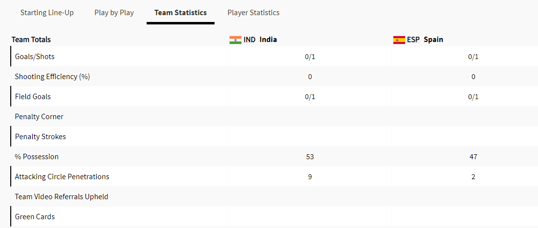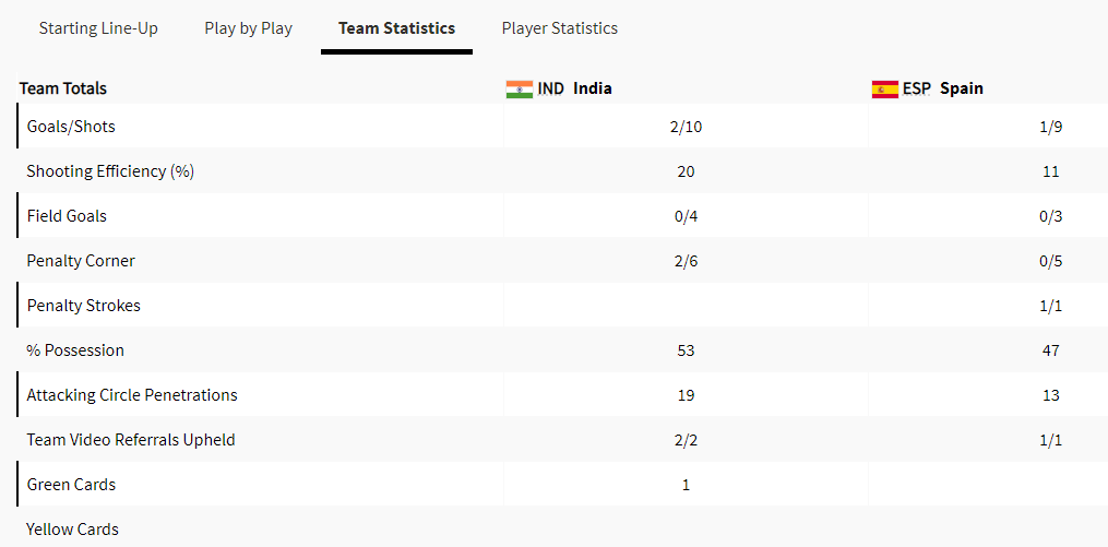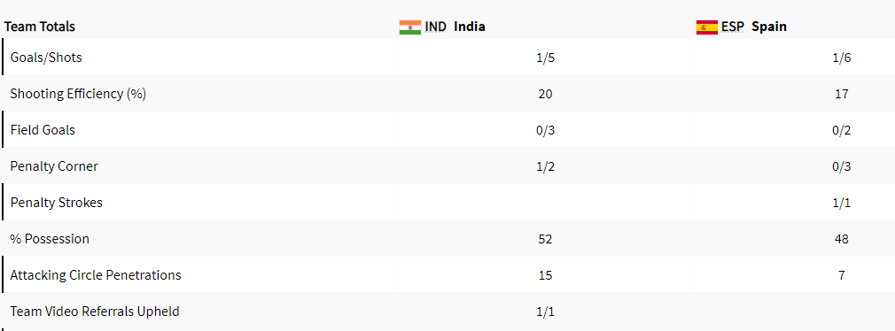 भारत और स्पेन की टीमें पहले हाफ के अंत तक 1-1 से बराबरी पर हैं। पॉजेशन के मामले में भारत आगे रहा। भारत को दो पेनल्टी कॉर्नर मिले जिसमें से उसने एक को बदला वहीं स्पेन तीन में से एक को भी गोल में नहीं बदल सका।