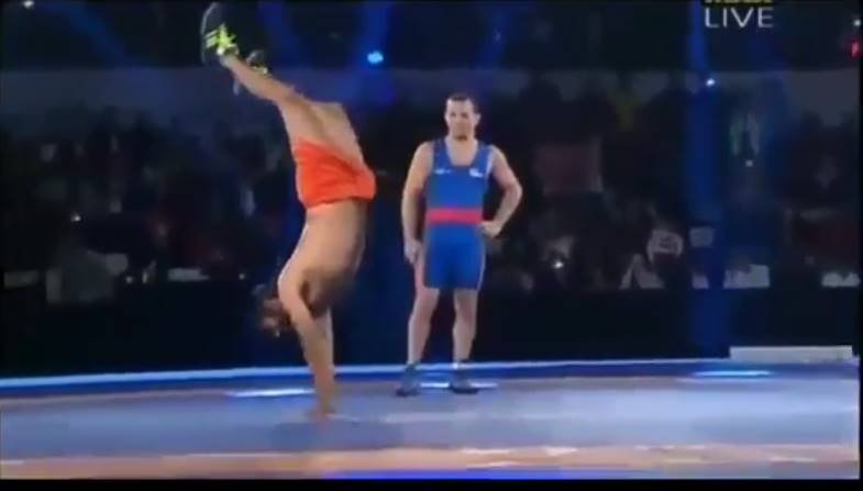 बाबा रामदेव अक्सर अपनी कारनामों के चलते खबरों में बने रहते है। लेकिन इस बार तो बाबा रामदेव ने कमाल ही कर दिया। बाबा रामदेव ने 2008 ओलंपिक के रजत पदक विजेता आंद्रे स्टेडनिक को ना सिर्फ मुकाबले के लिए चुनौती दी बल्कि उन्हें चारों खाने चित कर दिया। बाब रामदेव ने मंगलवार को फ्रेडली मैच के लिए आंद्रे के सामने चुनौती पेश की थी। इंदिरा गांधी इंडोर स्टेडियम में प्रो रेसलिंग के सेमीफाइनल से पहले दोनों का मुकाबला शुरू हुआ। सबको उम्मीद थी कि आंद्रे बाबा को आराम से हरा देंगे लेकिन हुआ ठीक इससे उल्टा। रिग में पहुंचते ही बाबा ने सबसे पहले सूर्य नमस्कार लगाया। उसके बाद वो अपने हाथ के बल चले। फिर रेफरी ने दोनों पहलवानों को आमने-सामने खड़ा किया और कुश्ती का मुकाबला शुरू हुआ। बाबा ने शुरू से ही मैच पर पकड़ बनाए रखी और आंद्रे पर पूरी तरह भारी पड़े। पूरे मैच में बाबा ने आंद्रे को एक भी अंक नहीं दिया और अंत में मैच 12-0 के अंतर से जीत लिया।
