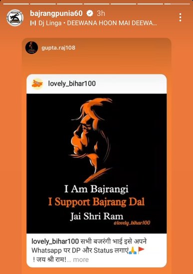 बजरंग पूनिया के इंस्टाग्राम पर एक स्टोरी शेयर की गई थी जो फैंस को ज्यादा पसंद नहीं आई। स्टोरी में हनुमान की तस्वीर बनी हुई थी और लिखा हुआ था, ‘मैं बजरंगी हूं, मैं बजरंग दल का समर्थन करता हूं, जय श्री राम।’