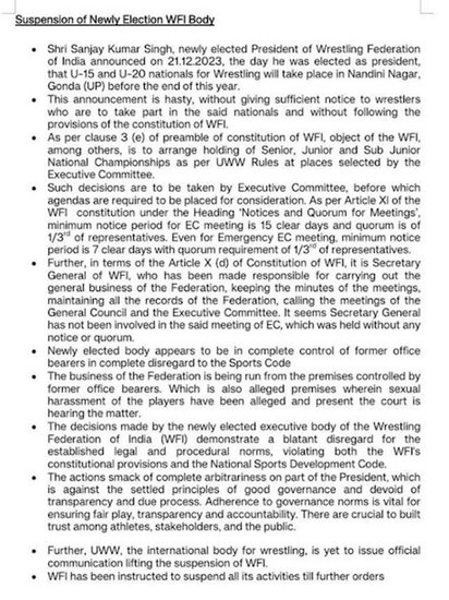 खेल मंत्रालय ने कहा कि नेशनल चैंपियनशिप की घोषणा जल्दबाजी में की गई और उचित प्रक्रिया का पालन नहीं किया गया। मंत्रालय ने यह भी कहा कि नया संघ पिछले पदाधिकारियों के पूर्ण नियंत्रण में प्रतीत होता है, जिनके खिलाफ यौन उत्पीड़न के आरोप लगाए गए थे। गौरतलब है कि डब्ल्यूएफआई का अध्यक्ष बनने के बाद संजय सिंह ने बृजभूषण सिंह से उनके आवास पर मुलाकात की थी। 21 दिसंबर 2023 को कुश्ती संघ का चुनाव हुआ था। काफी देरी के बाद यह चुनाव हुए थे।