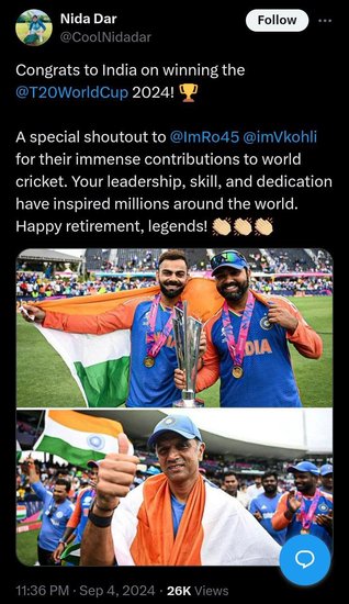 निदा डार ने एक्स पर रोहित शर्मा- विराट कोहली और भारतीय कोच राहुल द्रविड़ की तस्वीर शेयर की। तस्वीर के कैप्शन में उन्होंने लिखा, ‘भारत को टी20 वर्ल्ड कप जीतने पर बहुत बधाई। रोहित शर्मा और विराट कोहली को खास शाउटआउट। इन लोगों ने वर्ल्ड क्रिकेट को बहुत कुछ दिया है। उनकी लीडरशिप, स्किल और डेडिकेशन से इस दुनिया को बहुत प्रेरणा मिला है। हैप्पी रिटायरमेंट्स लेजेंड्स।’