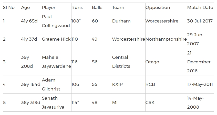 कॉलिंगवुड और ग्रीम के अलावा श्रीलंका के पूर्व बल्लेबाज महेला जयवर्धने ने 39 साल 208 दिनों की उम्र में टी20 क्रिकेट में शतक ठोका था। उनके अलावा पूर्व श्रीलंकाई कप्तान सनथ जयसूर्या और पूर्व अॉस्ट्रेलियाई विकेटकीपर एडम गिलक्रिस्ट भी उन खिलाड़ियों की सूची में हैं, जिन्होंने ज्यादा उम्र में शतक जड़ा है। गिलक्रिस्ट ने 2011 के आईपीएल में आरसीबी के खिलाफ 55 गेंदों में 106 रन ठोक दिए थे। तब उनकी उम्र 39 साल 184 दिन थी। जबकि जयसूर्या ने चेन्नई सुपरकिंग्स के खिलाफ 38 साल 319 दिनों में शतक जड़ा था।