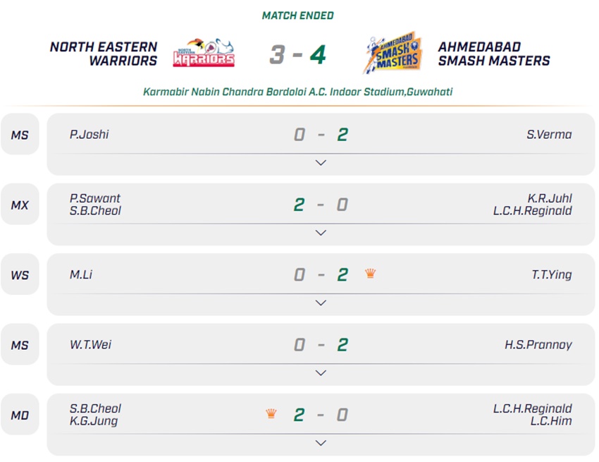 प्रीमियर बैडमिंटन लीग (पीबीएल) के सीजन-3 में मंगलवार (26 दिसंबर) को नॉर्थ ईस्टर्न वॉरियर्स और अहमदाबाद स्मैश मास्टर्स के बीच मुकाबला खेला गया, जिसमें अहमदाबाद ने 4-3 से जीत दर्ज की। अंकतालिका पर नजर डालें तो नॉर्थ ईस्टर्न वॉरियर्स 5 प्वाइंट्स के साथ टॉप पर है। वहीं अहमदाबाद 4 प्वाइंट्स के साथ पांचवें पायदान पर। गौरतलब है पीबीएल का यह सीजन 15 अंक प्रणाली पर खेला जा रहा है। पीबीएल में हर टीम को एक खिलाड़ी ट्रम्प खिलाड़ी के तौर पर उतारना होता है। अगर वह खिलाड़ी मैच हार जाता है तो उसके अंक काट लिए जाते हैं।