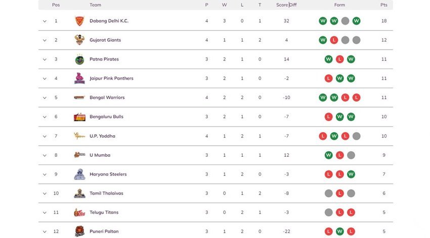 हालांकि, स्कोर डिफरेंस के मामले में वह पांचवें नंबर पर है। उसका स्कोर डिफरेंस -2 है। दबंग दिल्ली स्कोर डिफरेंस के मामले में भी शीर्ष पर है। उसका स्कोर अंतर 32 है। पटना पायरेट्स दूसरे नंबर पर है। उसका स्कोर डिफरेंस 14 है।