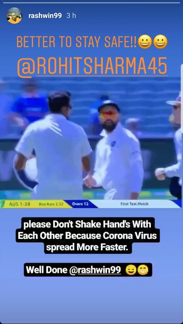 इसमें आप देख सकते हैं कि रोहित शर्मा अच्छी गेंदबाजी के लिए अश्विन को हाथ मिलाकर बधाई देने जाते हैं लेकिन अश्विन का ध्यान कहीं और होता है और वह रोहित से हाथ नहीं मिलाते हैं। अब उन्होंने यही वीडियो शेयर कर सभी को हाथ नहीं मिलाने की सलाह दी है। इसके हाथ ही रोहित शर्मा से हाथ नहीं मिलाने पर खुद को शाबाशी भी दी। उन्होंने लिखा कि सुरक्षित रहना अच्छा है।