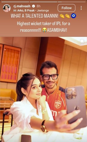 RJ महविश आम तौर पर चहल की टीम PBKS के मैच देखने जाती रहती हैं और वो PBKS vs KKR मैच देखनें भी पहुंचीं। मैच में युजवेंद्र चहल ने केकेआर के चार बल्लेबाजों को पवेलियन का रास्ता दिखाया, जिसके चलते सोशल मीडिया पर उनकी तारीफ होने लगी। RJ महविश ने चहल की तारीफ में अपने इंस्टाग्राम हैंडल पर स्टोरी लगाई, जिसके बैकग्राउंड में ‘जीतेंगे सारे वादे’ गाना भी एड किया।