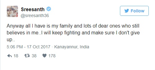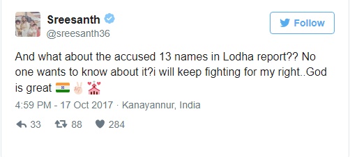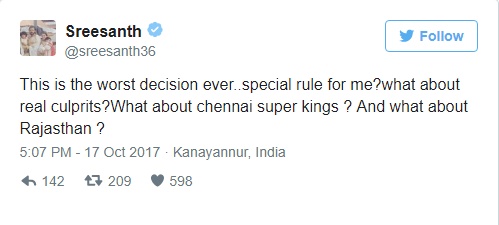 केरल हाई कोर्ट द्वारा मंगलवार को तेज गेंदबाज एस श्रीसंत पर लाइफटाइम बैन बरकरार रखे जाने के फैसले के बाद क्रिकेटर ने सिलसिलेवार ट्वीट कर इस आदेश की कड़ी आलोचना की। उन्होंने ट्वीट करते हुए उन 13 नामों का खुलासा करने को कहा, जो स्कैंडल में शामिल थे। अगस्त में केरल हाई कोर्ट ने सबूतों के आभाव में श्रीसंत से सभी आरोप हटा लिए थे, जिसके बाद बीसीसीआई ने अदालत का रुख किया था। ताजा आदेश में कोर्ट ने पुराने फैसले को पलट दिया। इसके बाद 34 वर्षीय श्रीसंत ने कहा कि उनके साथ जो अन्याय हुआ है, वह उसके खिलाफ लड़ते रहेंगे। ट्वीट में श्रीसंत ने लिखा, मेरे परिवार और करीबी लोगों को अब भी मुझ पर विश्वास है। मैं लड़ाई जारी रखूंगा और हार नहीं मानूंगा। दूसरे ट्वीट में उन्होंने लिखा, यह सबसे खराब फैसला है, मेरे लिए खास नियम। असली दोषियों का क्या? चेन्नई सुपर किंग्स का क्या? राजस्थान का क्या? तीसरे ट्वीट में तेज गेंदबाज ने कहा कि लोढ़ा कमिटी की रिपोर्ट में 13 आरोपियों के नाम थे, उनका क्या हुआ? कोई उसके बारे में जानना नहीं चाहता। मैं अपने अधिकार के लिए लड़ता रहूंगा। इस मामले में जो अन्य नाम सामने आए थे उनमें पूर्व बीसीसीआई अध्यक्ष एन श्रीनिवासन, आईपीएल के सीओओ सुंदर रमन, राजस्थान रॉयल्स के को-ओनर राज कुंद्रा और चेन्नई सुपर किंग्स के चीफ गुरुनाथ मयप्पन शामिल थे।