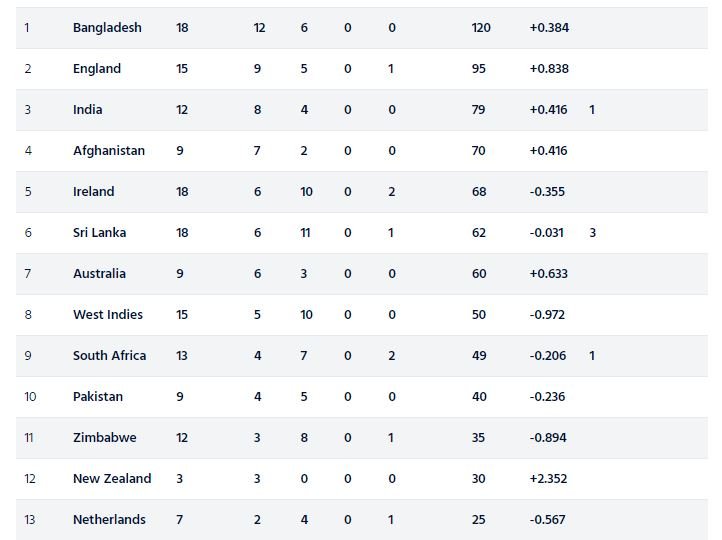 इसके अलावा बाकी दो टीमों का चयन साल 2023 में जिम्बाब्वे में होने वाले विश्व कप क्वालीफायर से होगा। इस टेबल में अभी 120 अंकों के साथ बांग्लादेश टॉप पर है। इसके बाद इंग्लैंड (95 पॉइंट्स) दूसरे, इंडिया (79 पॉइंट्स) तीसरे, अफगानिस्तान (70 पॉइंट्स) चौथे, आयरलैंड (68 पॉइंट्स) 5वें, श्रीलंका (62 पॉइंट्स) छठे, ऑस्ट्रेलिया (60 पॉइंट्स) 7वें और वेस्टइंडीज (50 पॉइंट्स) 8वें पायदान पर है।