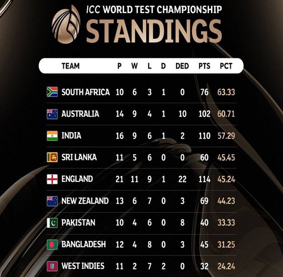 श्रीलंका का क्लीन स्वीप करने के बाद साउथ अफ्रीका ने ऑस्ट्रेलिया का घमंड भी तोड़ दिया। ऑस्ट्रेलिया की टीम ने भारत को दूसरे टेस्ट मैच में रविवार को एडिलेड में 10 विकेट से हराया था और वर्ल्ड टेस्ट चैंपियनशिप की अंकतालिका में पहले नंबर पर आ गई थी, लेकिन साउथ अफ्रीका ने श्रीलंका को हराने के बाद ऑस्ट्रेलिया को दूसरे नंबर पर धकेल दिया और अंकतालिका में पहले स्थान पर पहुंच गई। अब साउथ अफ्रीका की टीम 63.33 की जीत प्रतिशत के साथ पहले स्थान पर है तो वहीं ऑस्ट्रेलिया की जीत का प्रतिशत 60.71 है और वो दूसरे नंबर पर आ गई जबकि भारतीय टीम 57.29 की जीत फीसदी के साथ तीसरे स्थान पर है।