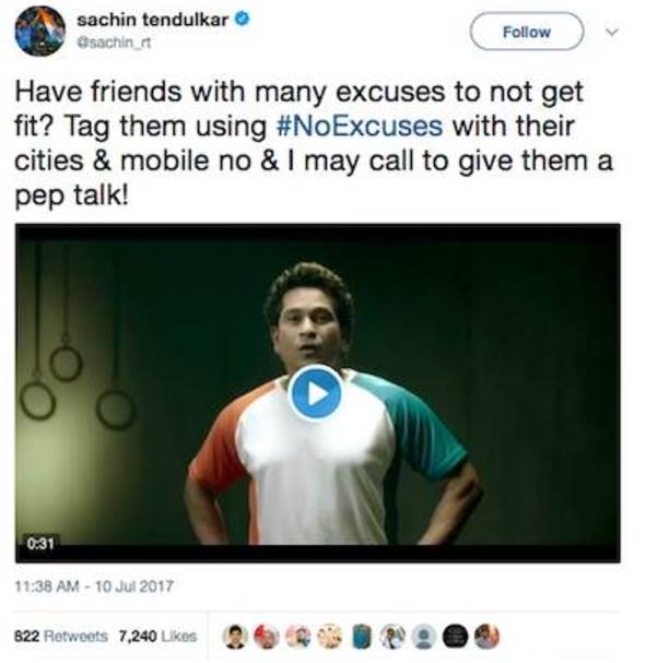 सोमवार को सचिन ने ट्वीट में कहा था, क्या आपके भी एेसे दोस्त हैं जो फिट न रहने के बहाने बताते रहते हैं। उन्हें #Noexcuses के हैशटैग के साथ उनका शहर और मोबाइल नंबर लिखकर मुझे भेजिए और उन्हें फोन करके प्रोत्साहित करूंगा। यह सभी जानते हैं कि पिछले दो दशकों में सचिन की न सिर्फ भारत बल्कि पूरे विश्व में करोड़ों की फैन फॉलोइंग है। लोग उन्हें भगवान का दर्जा देते हैं। यहां तक कि जब एक फैन ने किसी और से डिटेल शेयर न करने को कहा तो उसने उसकी बात को खारिज करते हुए कहा, कुछ नहीं होगा यार, भगवान ने बोला है तो करने का।