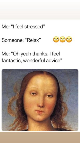 सानिया मिर्जा ने मीम शेयर किया है उसमें एक लड़की नजर आ रही है जिसके चेहरे पर कोई भाव नहीं है। मीम में लिखा है, ‘मैं – मुझे तनाव महसूस हो रहा है। समवन – रिलैक्स, मी – अच्छा, शुक्रिया, शानदार, कितनी बढ़िया राय है।’