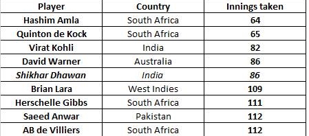 शानदार फॉर्म में चल रहे टीम इंडिया के ओपनर शिखर धवन ने श्रीलंका के खिलाफ पहले वनडे में 132 रन जड़कर टीम इंडिया को 9 विकेट से जीत दिला दी। धवन ने सिर्फ 71 गेंदों में शतक ठोक जड़ा। वह श्रीलंका के खिलाफ दूसरा सबसे तेज वनडे शतक जड़ने वाले खिलाड़ी बन गए हैं। यह धवन के करियर की 11वीं सेंचुरी थी। इसी के साथ वह विश्व क्रिकेट में 40 और भारत के 9वें एेसे खिलाड़ी बन गए हैं, जिन्होंने वनडे क्रिकेट में 11 सेंचुरी जड़ी हैं। अन्य 39 खिलाड़ियों में तीन ही एेसे खिलाड़ी हैं, जिन्होंने धवन से कम पारियां खेलकर 11 शतक जड़े हैं। धवन ने 86वीं पारी में यह मुकाम हासिल किया है। अॉस्ट्रेलिया के डेविड वॉर्न भी उन्हीं के साथ संयुक्त रूप से काबिज हैं। साउथ अफ्रीका के ओपनर्स हाशिम अमला और क्विंटन डी कॉक ने क्रमश: 64 और 65वीं पारी में 11 शतक जड़े थे। वहीं भारतीय कप्तान को यह मुकाम हासिल करने में 82 पारियां लग गई थीं।