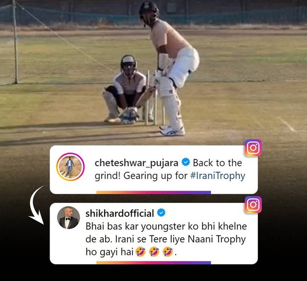 ईरानी ट्रॉफी 2023-24 सीजन की शुरुआत एक अक्टूबर से होगी और यह 5 अक्टूबर तक खेला जाएगा। इससे पहले पुजारा ने अपनी प्रैक्टिस की एक वीडियो जारी की और लिखा कि ईरानी ट्रॉफी के लिए कमर कस रहा हूं। इस वीडियो में पुजारा बल्लेबाजी की प्रैक्टि करते हुए दिख रहे हैं। उनके इस वीडियो को जवाब देते हुए शिखर धवन ने लिखा कि भाई बस कर अब यंगस्टर को भी खेलने दे। ईरानी से तेरे लिए नानी ट्रॉफी हो गई है। इसके बाद उन्होंने फनी सी इमोजी भी लगाई।