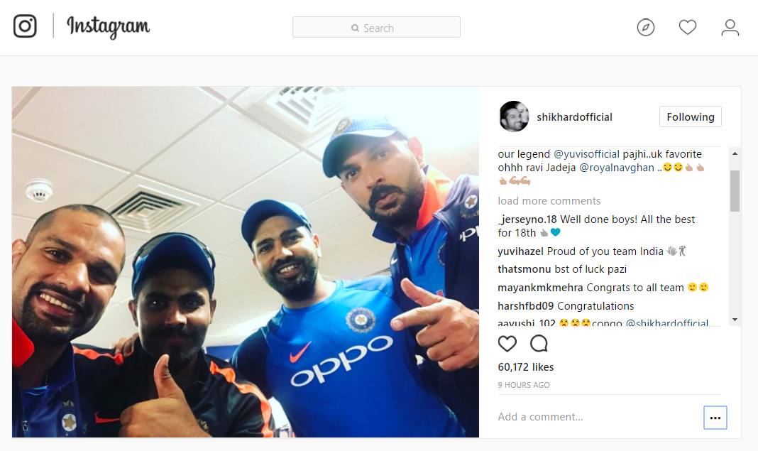 आईसीसी चैम्पियंस ट्रॉफी के सेमीफाइनल में बांग्लादेश को रौंदकर फाइनल में पहुंची टीम इंडिया का अगला मुकाबला अब पाकिस्तान से होगा। यह मैच लंदन के ओवल मैदान पर 18 जून को खेला जाएगा। भारत 2013 चैम्पिंयस ट्रॉफी का विजेता रह चुका है। लेकिन नौवीं बार ‘मिनी वर्ल्ड कप’ के फाइनल में पहुंचने पर सेल्फी तो बनती है। टीम इंडिया के गब्बर यानी शिखर धवन ने अपने आधिकारिक इंस्टाग्राम अकाउंट पर मैच के बाद एक सेल्फी पोस्ट की है, जिसमें उनके अलावा अॉलराउंडर रवींद्र जाडेजा, शतकवीर रोहित शर्मा और युवराज सिंह दिख रहे हैं। फोटो के कैप्शन में धवन ने लिखा, आज का मैच शानदार था। मेरे ओपनिंग पार्टनर रोहित शर्मा जबरदस्त खेले। दिग्गज युवराज सिंह ने एक और कीर्तिमान अपने नाम दिया और ब्रिटेन के पसंदीदा रवींद्र जाडेजा भी साथ हैं। इस तस्वीर को अब तक 56.9 हजार लोग लाइक कर चुके हैं और 401 लोगों ने इस पर कॉमेंट किया है।