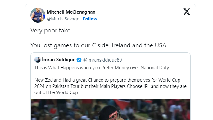 मिचेल मैकक्लेनाघन को यह बात हजम नहीं हुई। उनहोंने पाकिस्तान को उनका प्रदर्शन याद दिला दिया। मिचेल ने इस ट्वीट पर पूर्व कीवी खिलाड़ी मिचेल मैकक्लेनाघन ने ट्वीट किया और लिखा, ‘बहुत खराब विवरण है। तुम हमारी C टीम, आयरलैंड और अमेरिका की टीम से हारे।’ पाकिस्तान को न्यूजीलैंड के खिलाफ सीरीज में 2-1 से हार का सामना करना पड़ा था। इसके बाद उसे आयरलैंड के खिलाफ भी हार मिली। टी20 वर्ल्ड कप यह टीम मेजबान और पहली बार टी20 वर्ल्ड कप खेल रही अमेरिका की टीम के खिलाफ भी हार मिली।